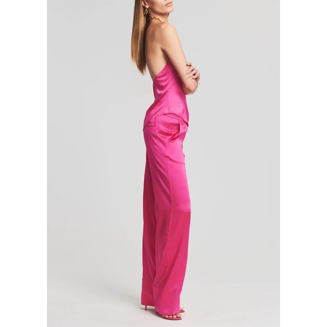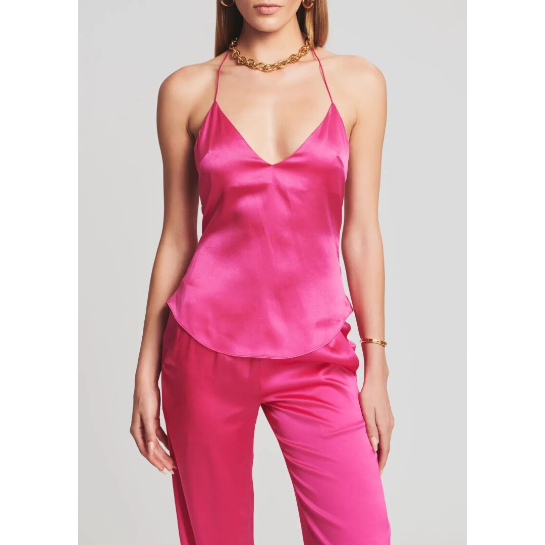 Elevate your wardrobe with this luxurious SER.O.YA Rachel Silk Satin Halter Camisole Top. The exquisite shade of fuchsia purple is perfect for any occasion, whether you're going for a bohemian vibe or a designer look. The butterfly-inspired theme adds a colorful touch to the solid pattern, making it a standout piece.